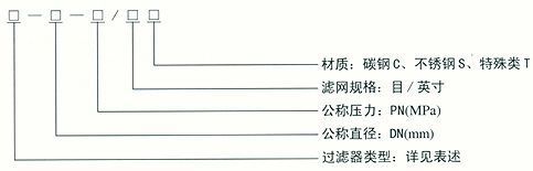 本公司生產的管道過濾器,主要有:1、Y型過濾器 2、T型過濾器 3、籃式過濾器 4、臨時過濾器 5、氣體過濾器。 其型號標注如下: